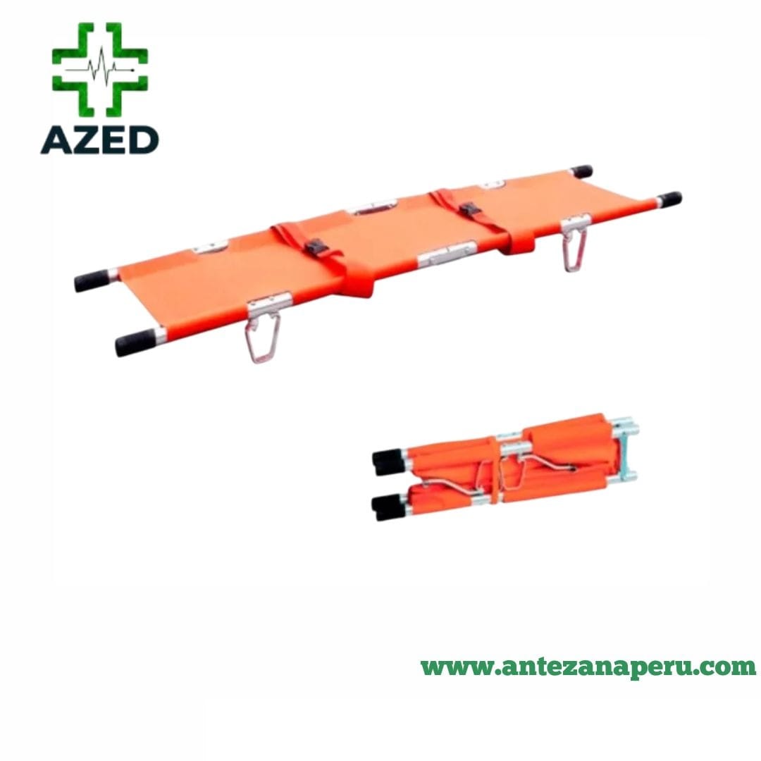 Es una camilla de emergencias y transporte manual con estructura metálica de aluminio ligero y resistente y tela de nylon plastificado que facilita su limpieza y desinfección. Resiste hasta 130 Kg siendo cómoda y segura tanto para el paciente como para los camilleros gracias al sistema de tensión de la camilla situado bajo la tela que asegura el total estiramiento de la estructura y de la tela sin peligro de moverse y a los agarraderos de caucho que ayudan a la prensión y evitan que se resbale de las manos.